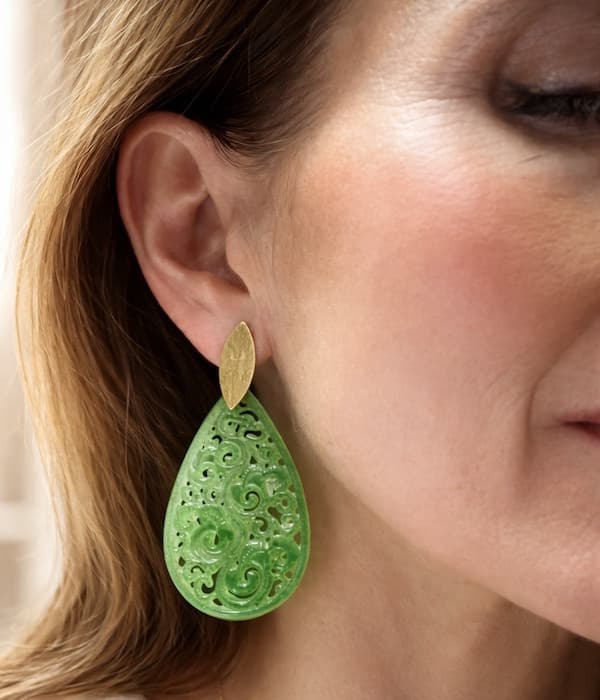 Los pendientes Capri en jade verde y plata recubierta de oro de 18 quilates, son el tipo de pendiente que transforma un look sencillo en un look inolvidable. Si dudas entre discreta o espectacular, alquila los pendientes Capri.